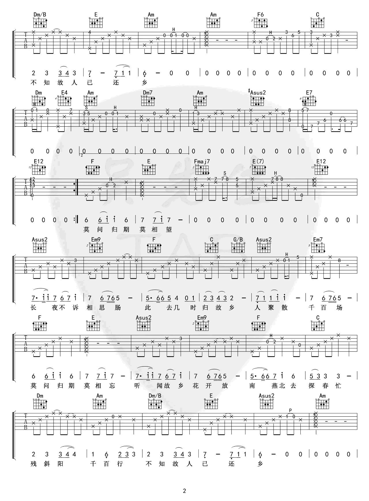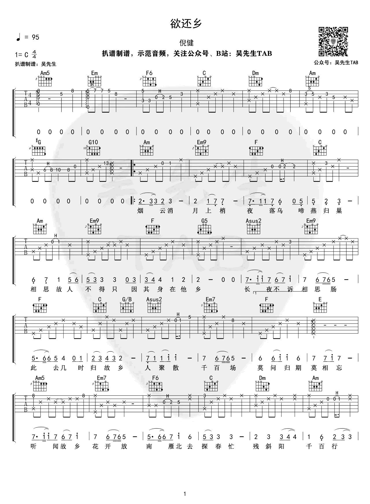 欲还乡吉他谱_倪健_C调带前奏_弹唱六线谱 时间:2021-06-15 来源:吴先生TAB 点击:次 欲还乡吉他谱,倪健词曲原创的一首民谣歌曲,欲还乡吉他弹唱谱,C调和弦编配,三张图片六线谱,易唱网整理上传,更新吴先生TAB扒谱分享。 午夜梦回时,落寞失意时,功成名就时,我们怀念故乡的情绪就会越发浓厚。在踏上远方的那一刻,故乡已不再是一个居所,已经成为了一种精神的寄托。