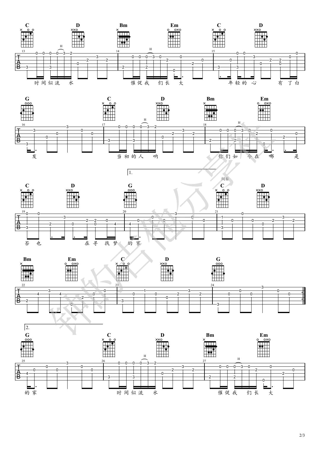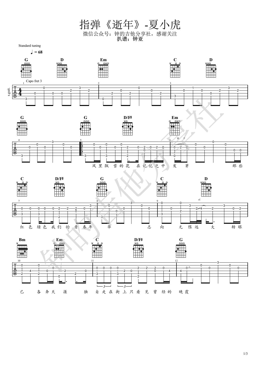逝年指弹吉他谱_夏小虎_G调指法_吉他独奏演示视频 时间:2021-06-18 来源:钟亚 点击:次 逝年指弹吉他谱,改编自夏小虎的一首让人沉静的民谣歌曲。逝年吉他独奏谱,三张图片谱例。感谢钟的吉他分享社编配分享,易唱网整理上传。 歌曲原调降B调,变调夹加3品,G调指法编配。G调和弦:G-Am-Bm-C-D-Em-#Fdim(或者D7);这首歌主要和弦走向:C-D-Bm-Em-C-D-G;和弦级数走向即:4-5-3-6-4-5-1,副歌常用和弦走向。