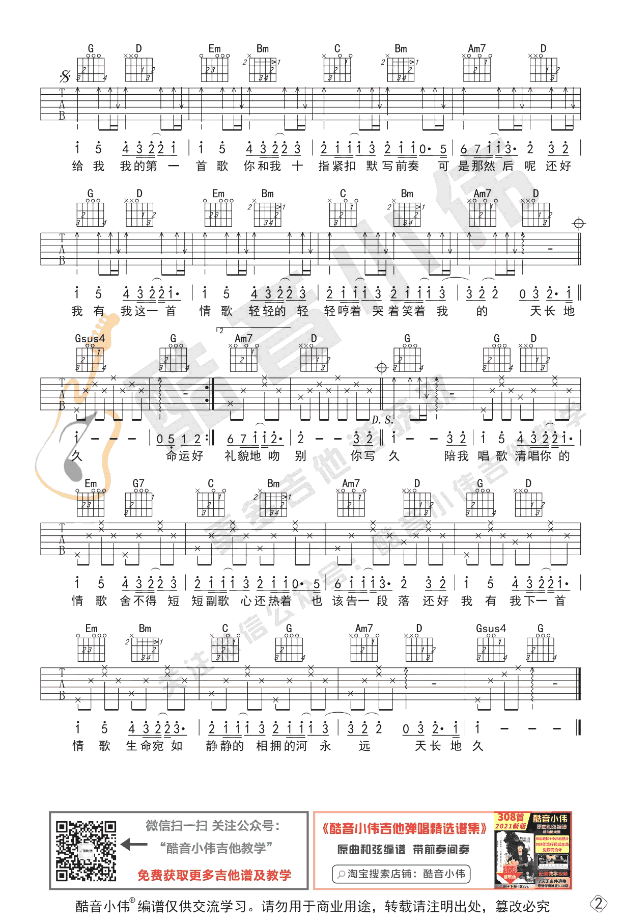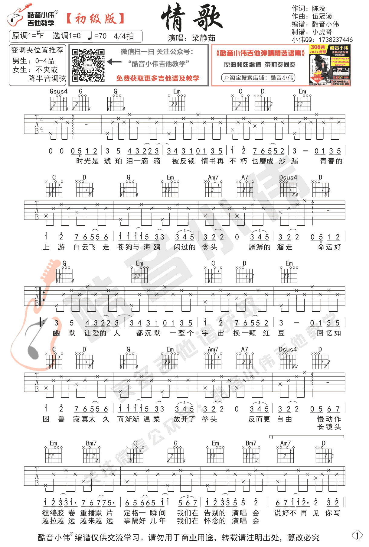 情歌吉他谱_梁静茹_G调简单版_初级弹唱谱 时间:2021-06-29 来源:酷音小伟 点击:次 情歌吉他谱,梁静茹的一首经典歌曲。情歌六线谱,原调升F选用G调指法,简单版编配,变调夹推荐男生0-4品女生不夹或降半音调弦,感谢酷音小伟出品,易唱网整理分享。 一首让人沉淀和感动的情歌,娓娓诉说着时光的流转与爱情的变换,给人无尽疗愈和慰安。“一整个宇宙,换一颗红豆。”又有多少人将这句词写在了自己曾经的QQ签名上呢?