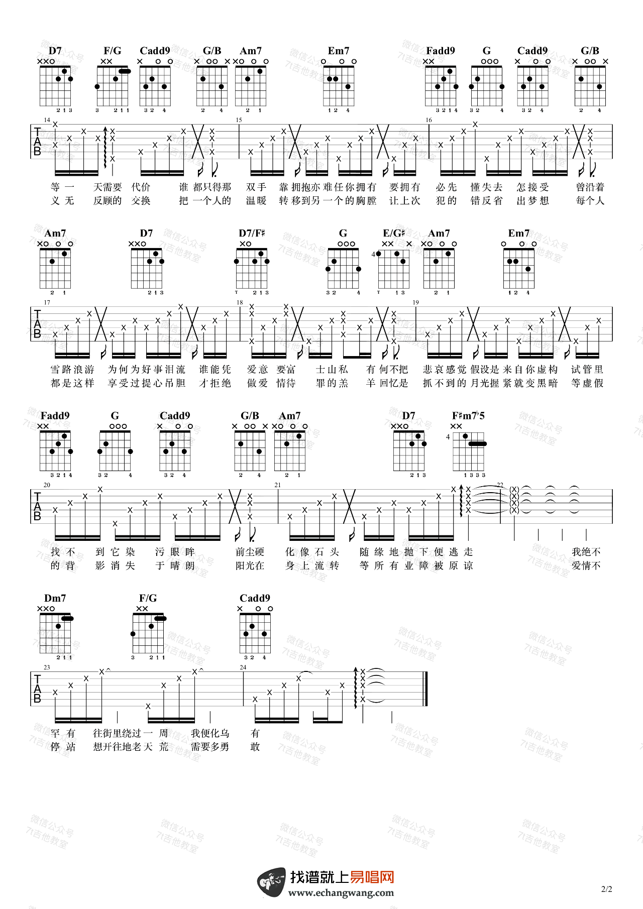 歌曲的最后还用了升四级半减七 F#m7-5,不过这首歌里面会稍微有点变化,在六级和升四级之间多了一个二级属七,其实D7与F#m7-5的构成音极其类似,可以把它们当成一个整体去看待,D7的组成音是(D,F#,A,C);而F#m7-5的构成音是(F#,A,C,E),只有一个音不同,而且这两个和弦的色彩效果大部分来自于F#和C这两个音的减五度音程,其它音的影响并不大,因此这两个和弦可以看作是升四级用法的一个延伸变化,不过这种其实并不多见,大家当作个例来学习积累就可以了~