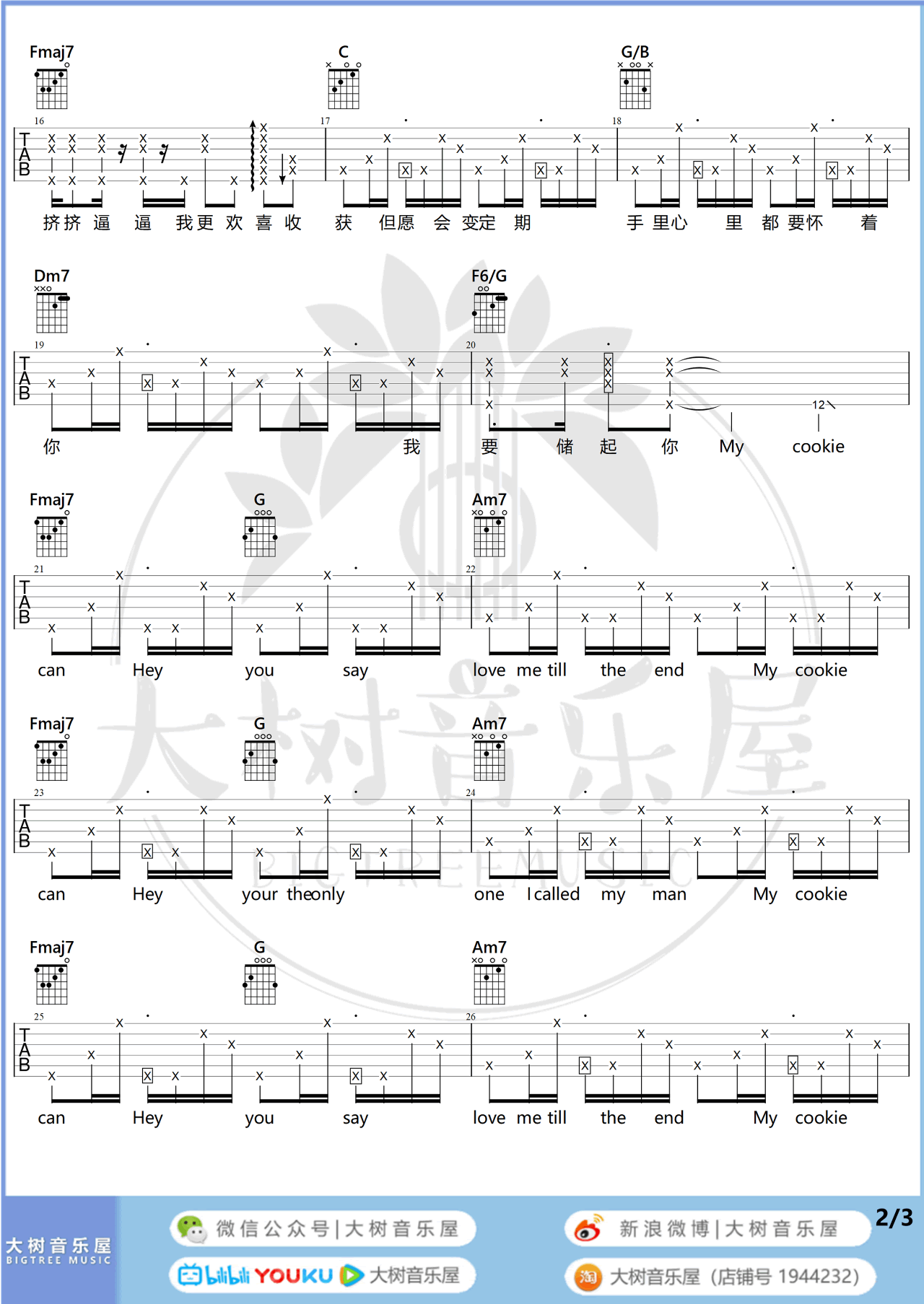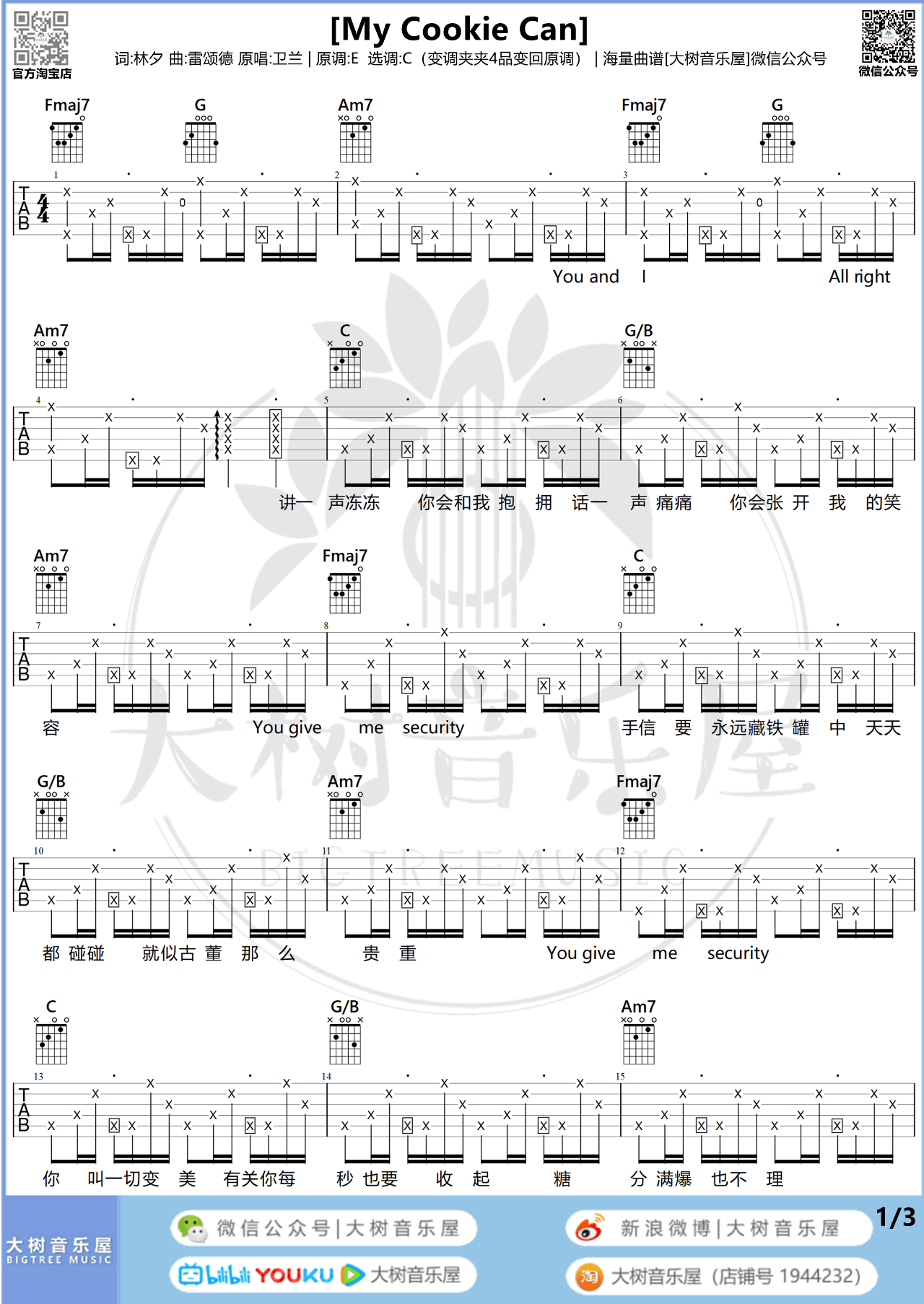 My Cookie Can吉他谱_卫兰_C调_吉他弹唱演示视频 时间:2021-07-05 来源:大树音乐屋 点击:次 My Cookie Can吉他谱,卫兰的一首粤语歌曲,讲一声冻冻,你会和我抱拥,《My Cookie Can》吉他六线谱,原调E选调C,变调夹夹四品变回原调,三张图片谱,同步吉他弹唱演示视频方便琴友们练习,易唱网感谢大树音乐屋出品。 最近卫兰的这首老歌又火了起来,在某音疯狂洗脑,不管是歌词还是旋律,都是满满的甜蜜,让人心动值up up up的小情歌,听完就想谈恋爱。