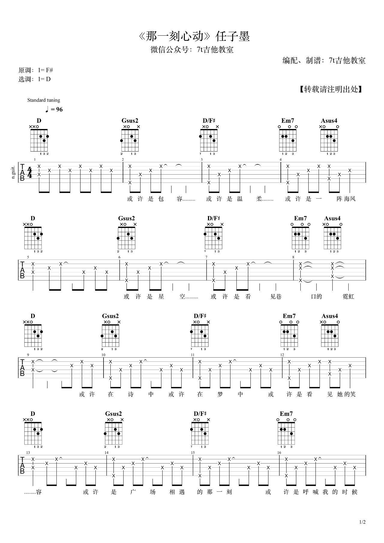 那一刻心动吉他谱,任子墨演唱的一首甜蜜情歌,那一刻心动六线谱,原调升F选调D,老师在弹唱视频中是标准音调弦,没有使用变调夹。如果想弹原调需要夹第四品。感谢7T吉他教室编配出品,易唱网整理上传。和弦分析:和弦色彩方面,四级用了sus2;二级、六级用了小七;五级用了sus4。整首歌的和弦走向很简单,主要都是 Gsus2 → D/F# → Em7 → Asus4 → D 的循环,前面的 Gsus2 → D/F# → Em7 是很常见的斜杠和弦的运用。后面就是接属和弦回到一级。最后有一个 D7 → Gsus2,这里是副属和弦的运用。