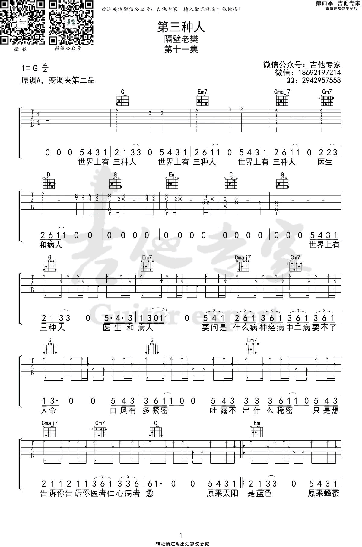 第三种人吉他谱_隔壁老樊_G调弹唱谱 时间:2021-08-11 来源:吉他专家 点击:次 第三种人吉他谱,隔壁老樊在《我是唱作人2》节目创作的一首民谣歌曲,第三种人吉他弹唱谱,原调A选调G,变调夹夹第二品,两张图片六线谱。易唱网感谢吉他专家编配制谱分享。 其实我们每个人的内心,都或许存在着另一个自己,一个觉得他的世界里太阳是蓝色,蜂蜜是苦的自己,他是孤独的被认为是不同于常人的,他渴望着有一个能够理解自己的人,他渴望一个能够真正救赎他孤寂灵魂的人。