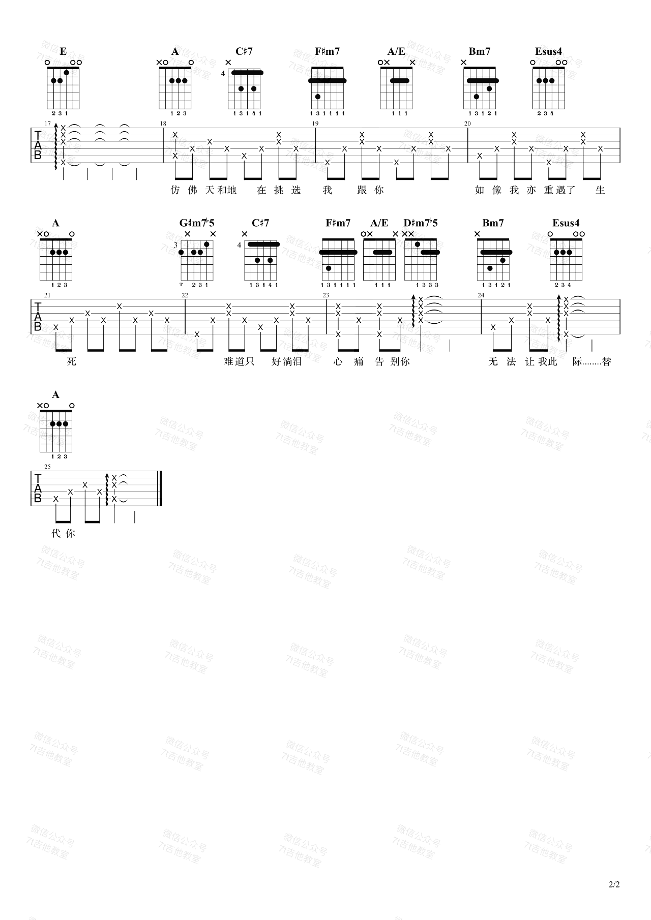 7T吉他教室和弦分析:首先基本的和弦色彩方面,四级用了maj7;五级用了sus4;二级、三级、六级用了小七。主歌是一个经典的卡农走向,并且用了很多斜杠和弦,使得低音有一个顺畅的下行 A → E/G# → F#m7 → A/E → Dmaj7 → A/C# → Bm7。 歌曲有几个地方用了副属和弦的用法 C#7 → F#m7,「难道只好淌泪……」在副属和弦的基础上还加了二级,形成了251离调 G#m7-5 → C#7 → F#m7,同样的这句还用了升四级半减七 F#m7 → A/E → D#m7-5。