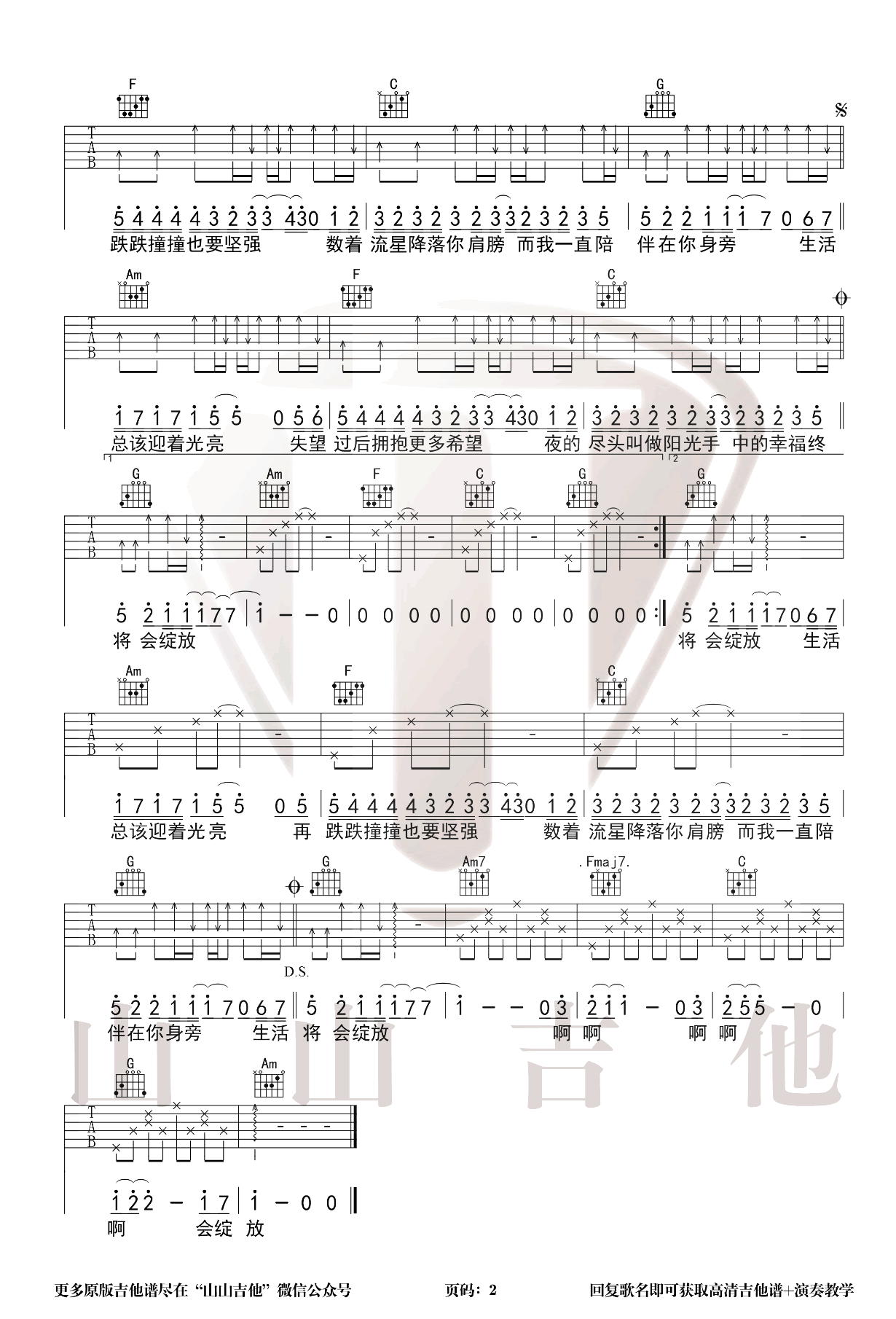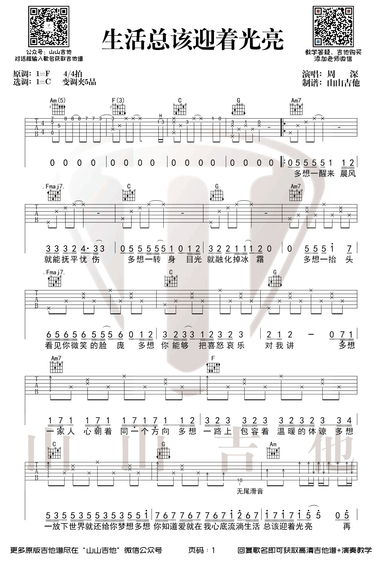 生活总该迎着光亮吉他谱_周深_C调_弹唱教学视频 时间:2021-09-06 来源:山山吉他 点击:次 生活总该迎着光亮吉他谱,周深献唱电视剧《乔家的儿女》主题曲。生活总该迎着光亮吉他六线谱+弹唱教学视频,原调F选调C,变调夹夹五品。两张图片谱,感谢山山吉他出品分享。 一首非常励志的歌曲,歌声充满份力量和勇气。激励着我们在未知的人生旅途中,披荆斩棘无所畏惧,勇往前闯向阳而行!