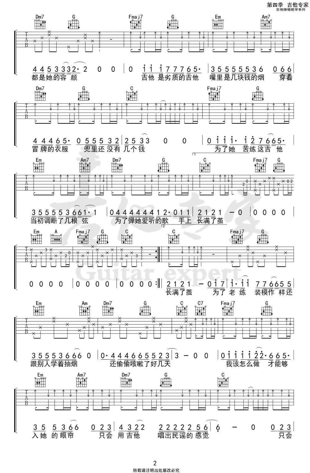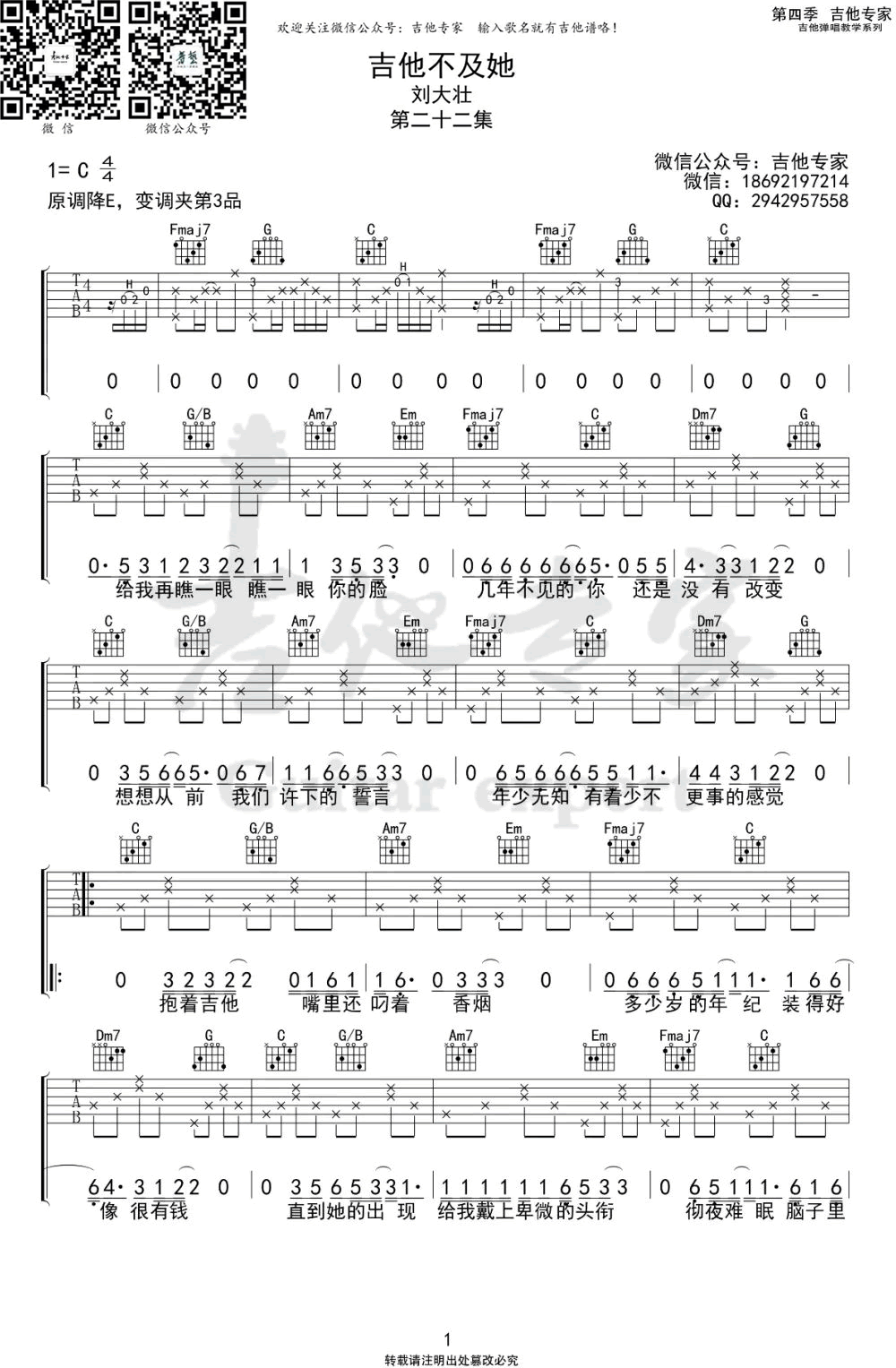 吉他不及她吉他谱_刘大壮_C调_弹唱六线谱 时间:2021-09-28 来源:吉他专家 点击:次 吉他不及她吉他谱,刘大壮的一首吉他弹唱歌曲,吉他不及她六线谱,原调降E,选调C,变调夹夹第三品,共三张图片谱。感谢吉他专家制谱分享,易唱网更新上传。 遗憾总跟青春绑在一起,这路遥马急的人间,我们又能陪彼此几年。手里抱着吉他嘴上叼着烟,你多久没有满怀期待的一觉到天亮了?