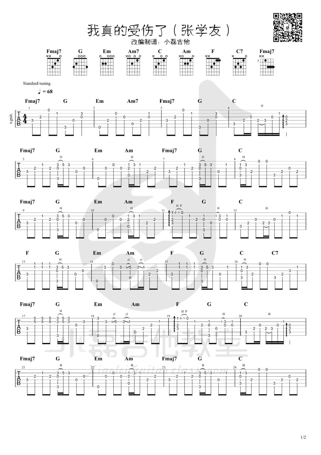 我真的受伤了指弹谱_张学友_吉他指弹教学视频 时间:2021-10-02 来源:小磊吉他 点击:次 我真的受伤了指弹吉他谱,张学友的经典歌曲改编,我真的受伤了吉他独奏谱,带前奏,两张图片谱例,感谢小磊吉他编配出品,并带来吉他指弹教学视频,易唱网上传分享。 对于我们这一代80后来说,港台歌手对我们的音乐审美的培养起到了根本的作用,当然提到港台音乐,歌神张学友自然是浓厚的一笔。这首老歌旋律简单清晰,段落不复杂,老师改编的这个版本的指弹乐谱也是尽可能降低了难度,其实也是C调常见的和弦编排方式,整体难度不高。