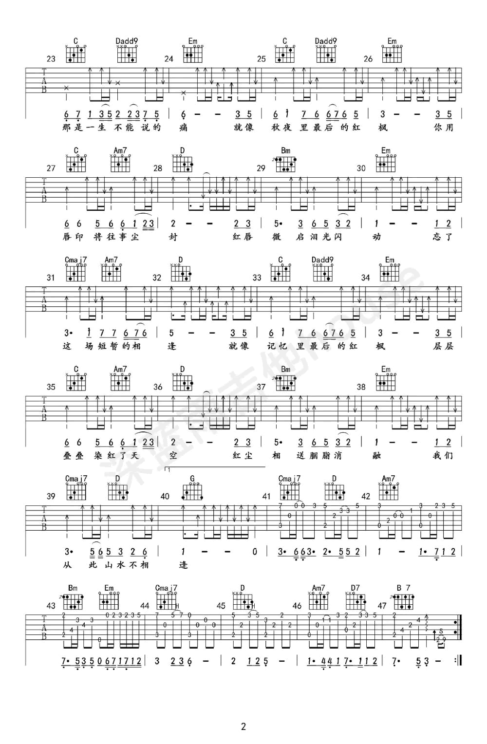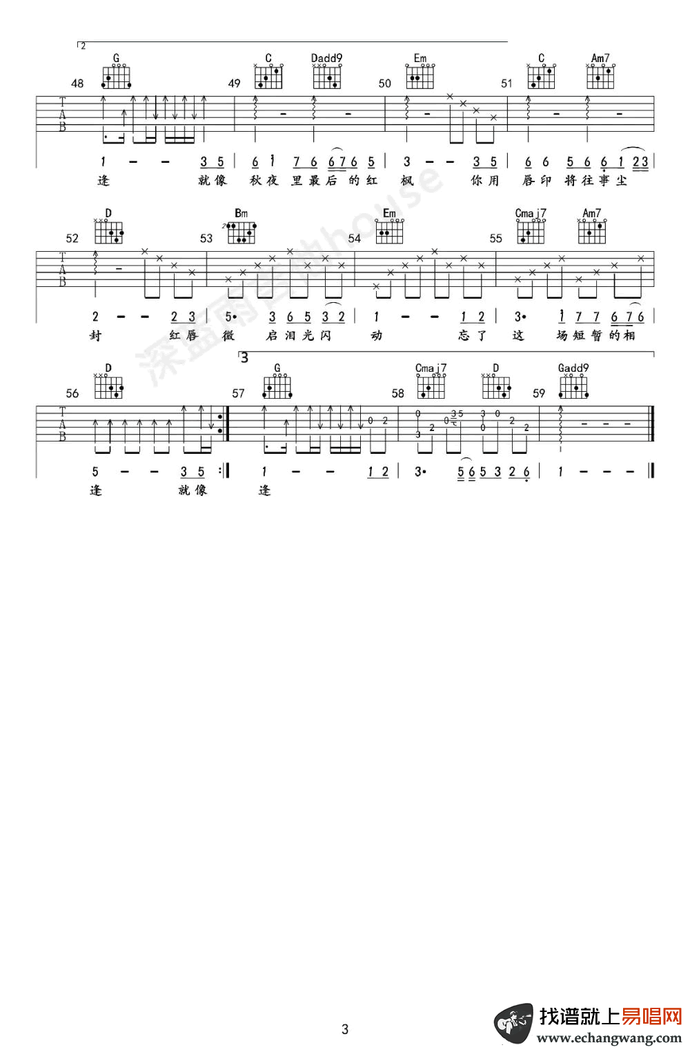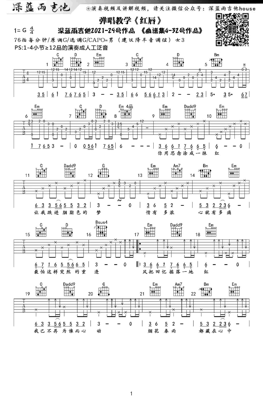 红唇吉他谱_安静_G调弹唱谱_《红唇》吉他演示视频 时间:2021-10-10 来源:深蓝雨吉他 点击:次 红唇吉他谱,安静演唱的一首网络歌曲,红唇吉他六线谱,选用C调和弦指法编配,男生建议降半音调弦,女生变调夹夹第三品。原曲节奏起伏较大,单单一把吉他是比较难操作的,所以我们在演奏时,尤其副歌部分扫弦的时候,力度上要有起伏,把节奏的轻重缓急处理好,这样才有味道!感谢深蓝雨吉他教学出品,易唱网整理更新。 开头的人工泛音,要多加练习,不然极容易犯错误,特别有些同学不注意指甲的修剪,演奏起来就更加困难,所以指甲修剪是很有必要的,要在平时的练习中多加注意,并形成适合自己的正确指甲形状!间奏跨度有点大,对于初学有一定的难度,不过你的手指如果比较长,这是有一定优势的!整体难度也不大! 欢迎微信关注二维码,加入深蓝雨吉他教学课程