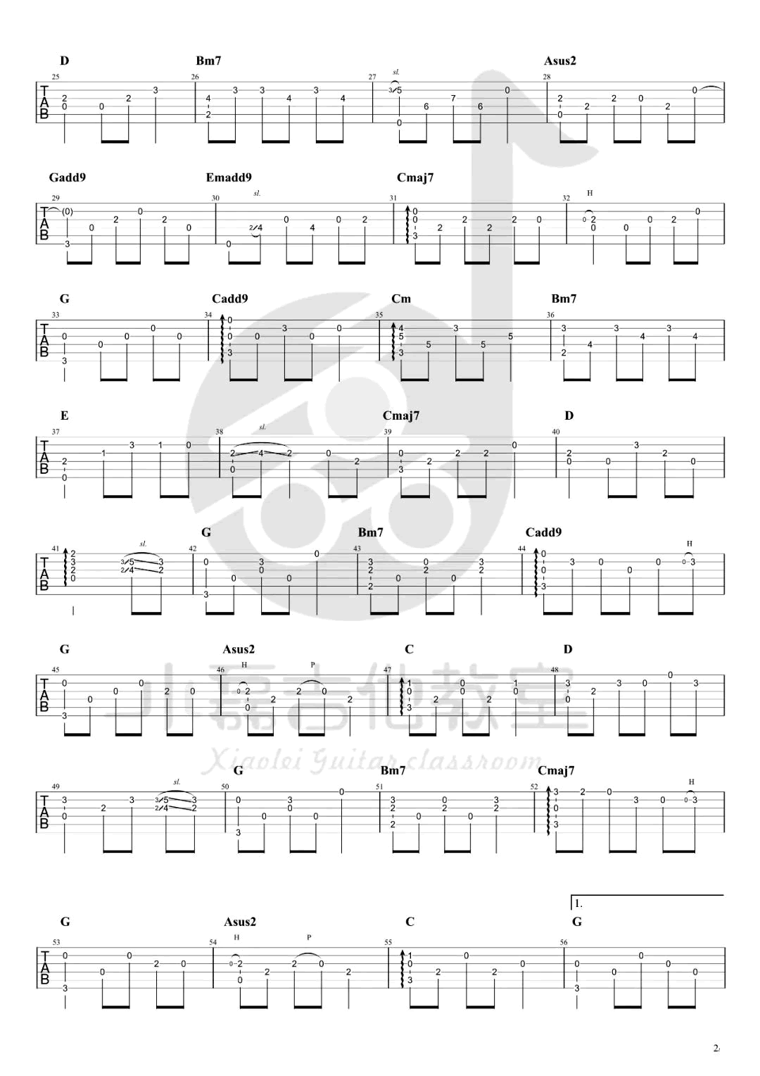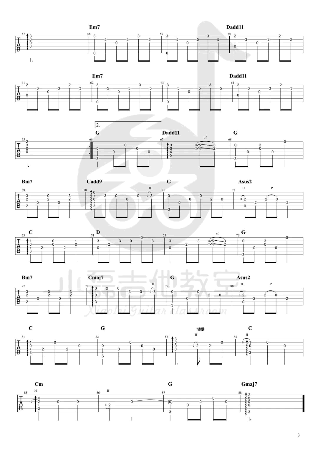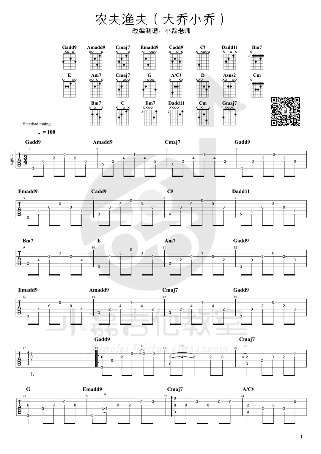 农夫渔夫指弹谱_大乔小乔_吉他独奏谱_指弹教学视频 时间:2021-10-15 来源:小磊吉他 点击:次 农夫渔夫吉他指弹谱,大乔小乔演唱的一首民谣歌曲改编,农夫渔夫吉他独奏谱+指弹教学视频,完整编配共三张图片谱。感谢小磊吉他编配出品,易唱网更新上传。 这首歌原版是小猛的作品,被大乔小乔翻唱后,有了一定的知名度,其实这首歌弹唱起来也是非常不错的,旋律动听歌词唯美,算是一首很完整的民谣曲目!我们改编的指弹版本乐谱尽量保留了前奏和间奏的吉他部分,在旋律部分尽量做到了简化,还是很有练习的必要的!喜欢这首歌的同学可以下手了!