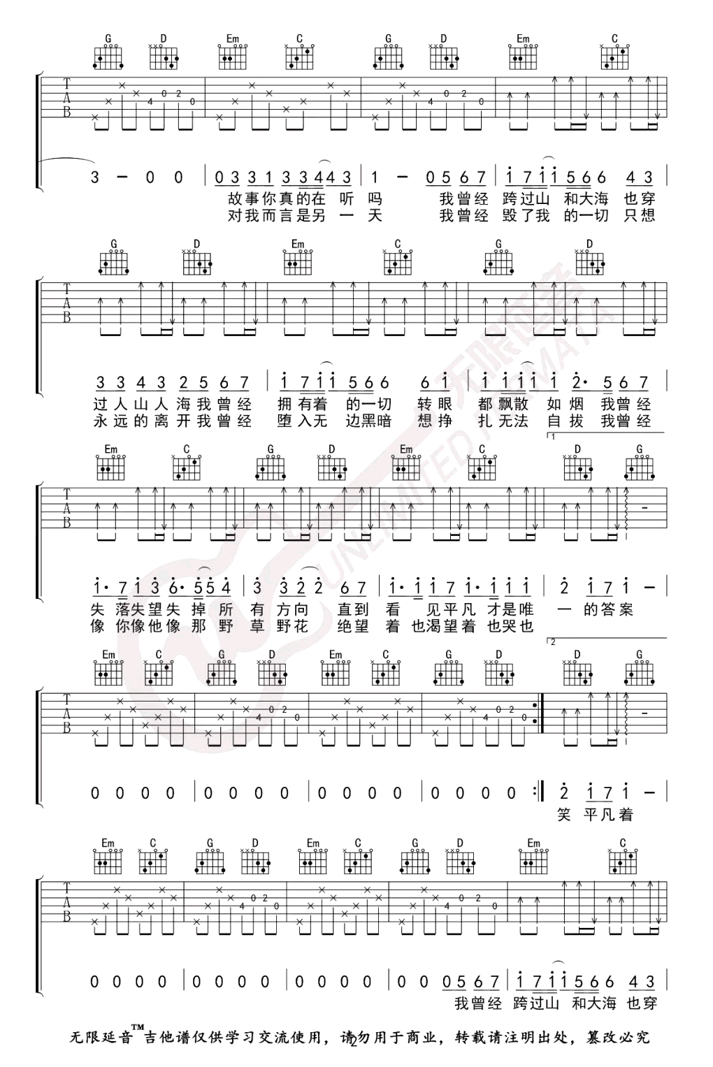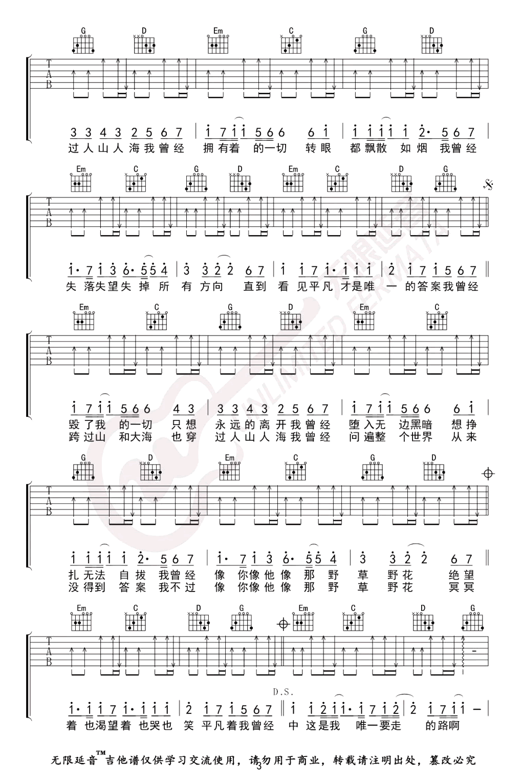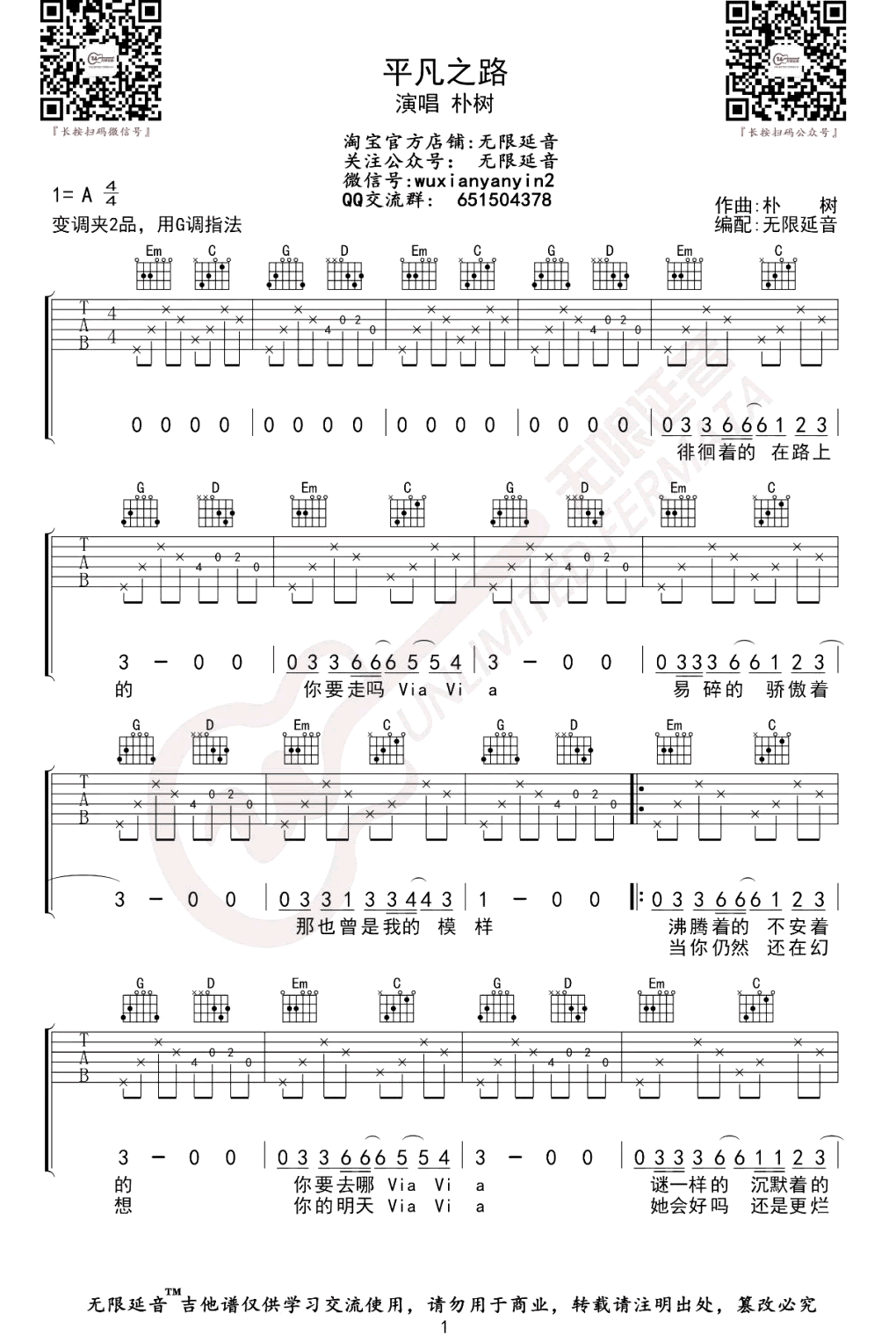 平凡之路吉他谱_朴树_G调弹唱谱_吉他教学视频 时间:2021-10-18 来源:无限延音 点击:次 平凡之路吉他谱,朴树的一首经典代表歌曲,电影《后会无期》主题曲。平凡之路吉他六线谱,原调A选调G变调夹夹二品,完整编配版本共四张图片谱例。感谢无限延音出品,易唱网整理分享。 随谱同步更新《平凡之路》吉他弹唱教学,喜欢这首歌曲的琴友们跟随老师的讲解示范练习起来。我们就如路边的野草野花一般,平凡而又渴望着不平凡的人生倔强地矗立。平凡着,以骄傲的姿态而生,这或许就是我们所要走的路吧。