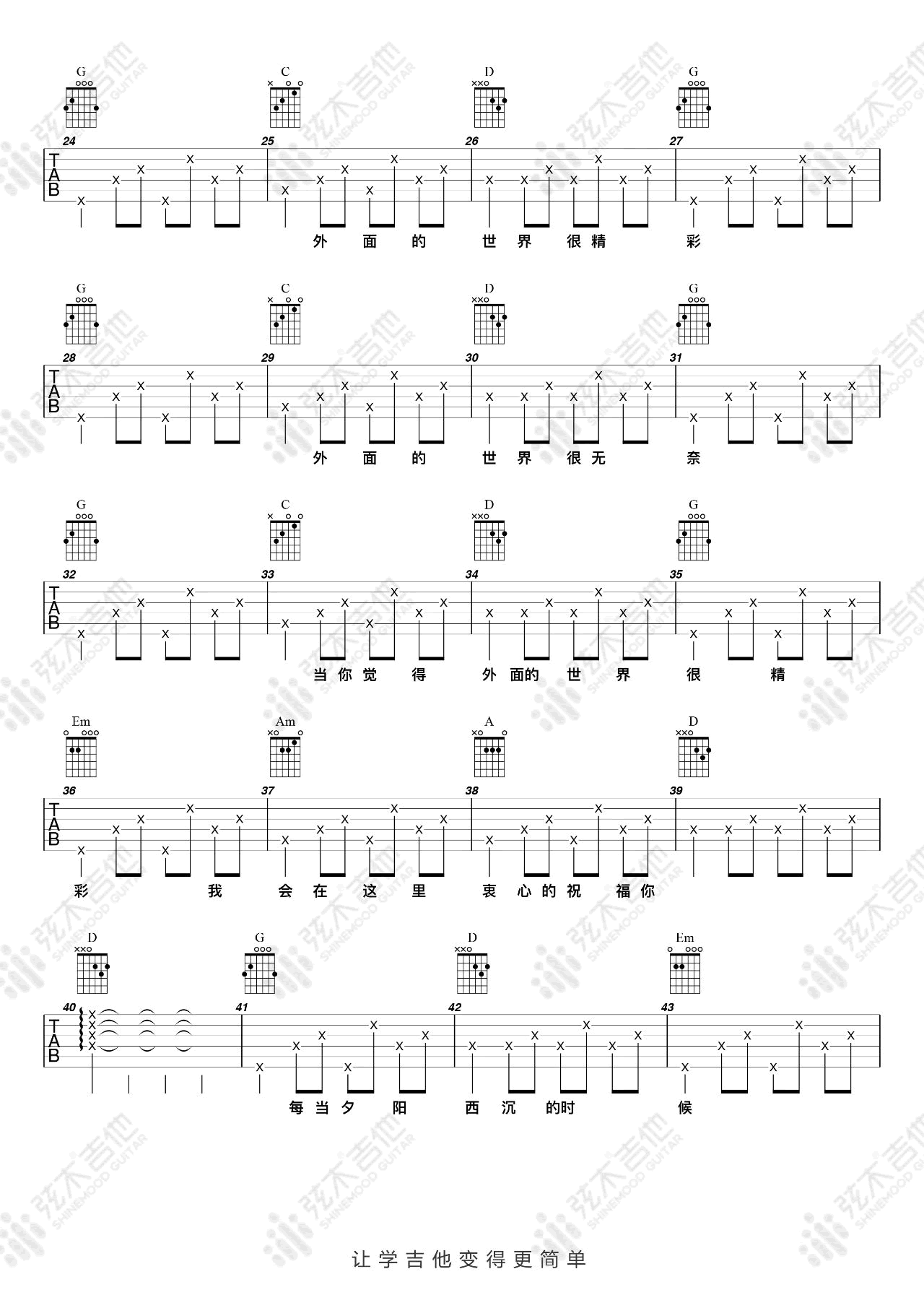 外面的世界吉他谱_齐秦_G调简单版_弹唱教学视频 时间:2021-10-22 来源:弦木吉他 点击:次 外面的世界吉他谱,齐秦的经典代表歌曲,《外面的世界》吉他弹唱教学,选用G调指法编配,男生不用变调夹,女生弹唱夹四品会比较舒服。曲谱共三张图片谱例,感谢弦木吉他编配出品,易唱网更新上传。 歌曲唱出了游子的无奈和心酸,简单的旋律却能够催人泪下。我们总是向往着外面的世界,因为天空广阔,给了我们一个无限大的平台,自由飞翔,任情遨游。今天就跟着我们的张老师,一起来学习用吉他弹唱这首歌吧~