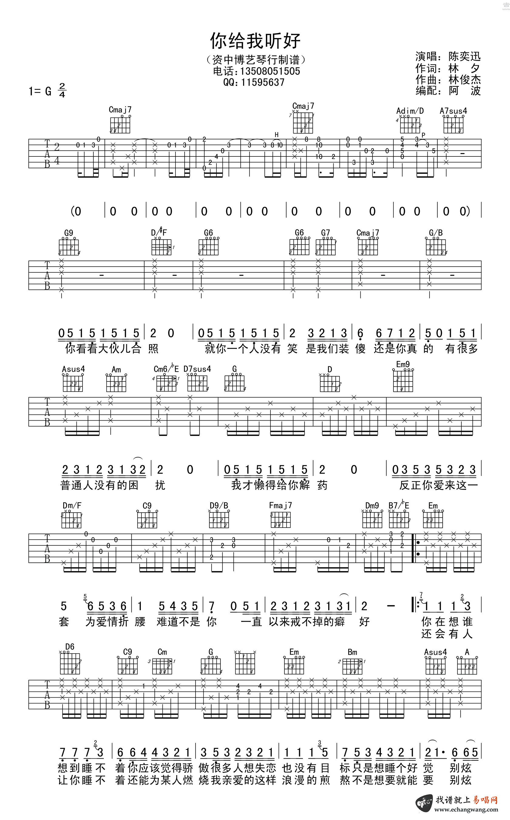 你给我听好六线谱_陈奕迅_G调弹唱谱_高清版 时间:2020-10-21 来源:阿波 点击:次 陈奕迅《你给我听好》吉他谱,G调指法,弹唱高清图片谱共三张。一首苦情但又故作坚强的歌,你给我听好吉他六线谱,阿波编配制谱,易唱网整理分享。 单曲循环听的其实是心情,一首陈奕迅好听的国语新歌,让人爱上歌曲的旋律,林夕的词依然那么传神,让人情不自禁被打动,仿佛歌里写的就是你我的故事和经历。